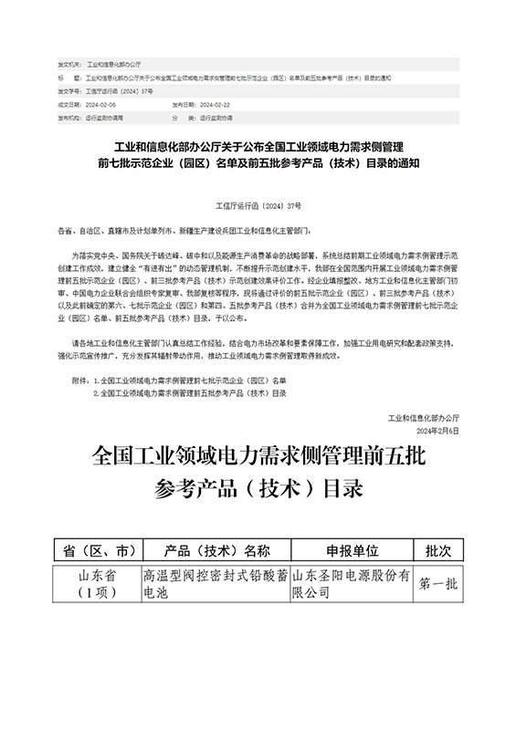 近日,工业和信息化部办公厅发布《全国工业领域电力需求侧管理前七批示范企业(园区)名单》和《全国工业领域电力需求侧管理前五批参考产品(技术)目录》,圣阳股份高温型阀控密封式铅酸蓄电池列入全国工业领域电力需求侧管理批参考产品(技术)目录。